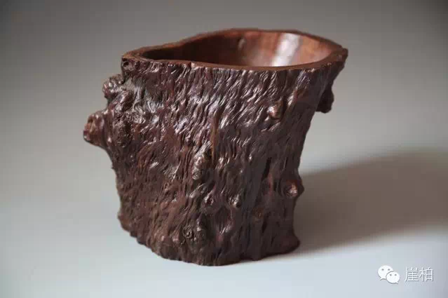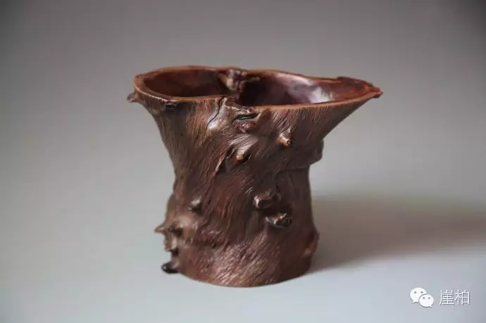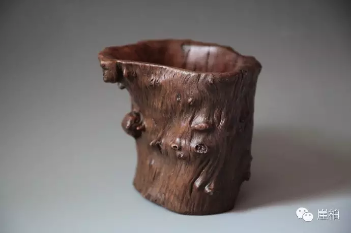 为什么认为这些作品是酒杯,而不是笔筒?主要原因有三个:(1)这些柏根作品都雕刻出了“流”的形状。这种形状如果插笔,笔就东倒西歪,很不整齐美观,但是用之喝水或喝酒,却十分妥当。(2)风寒湿引起的关节疼痛以及风湿性关节炎是常见病,即使到今天也是顽症。而柏根治疗之法是煮汁泡酒,用之作为泡酒杯合情合理。(3)这些柏根作品已经没有香气,这极可能是酒精将所含挥发物提取出来了。这一点很像明末清初的沉香酒杯,沉香酒杯也没有任何香气。